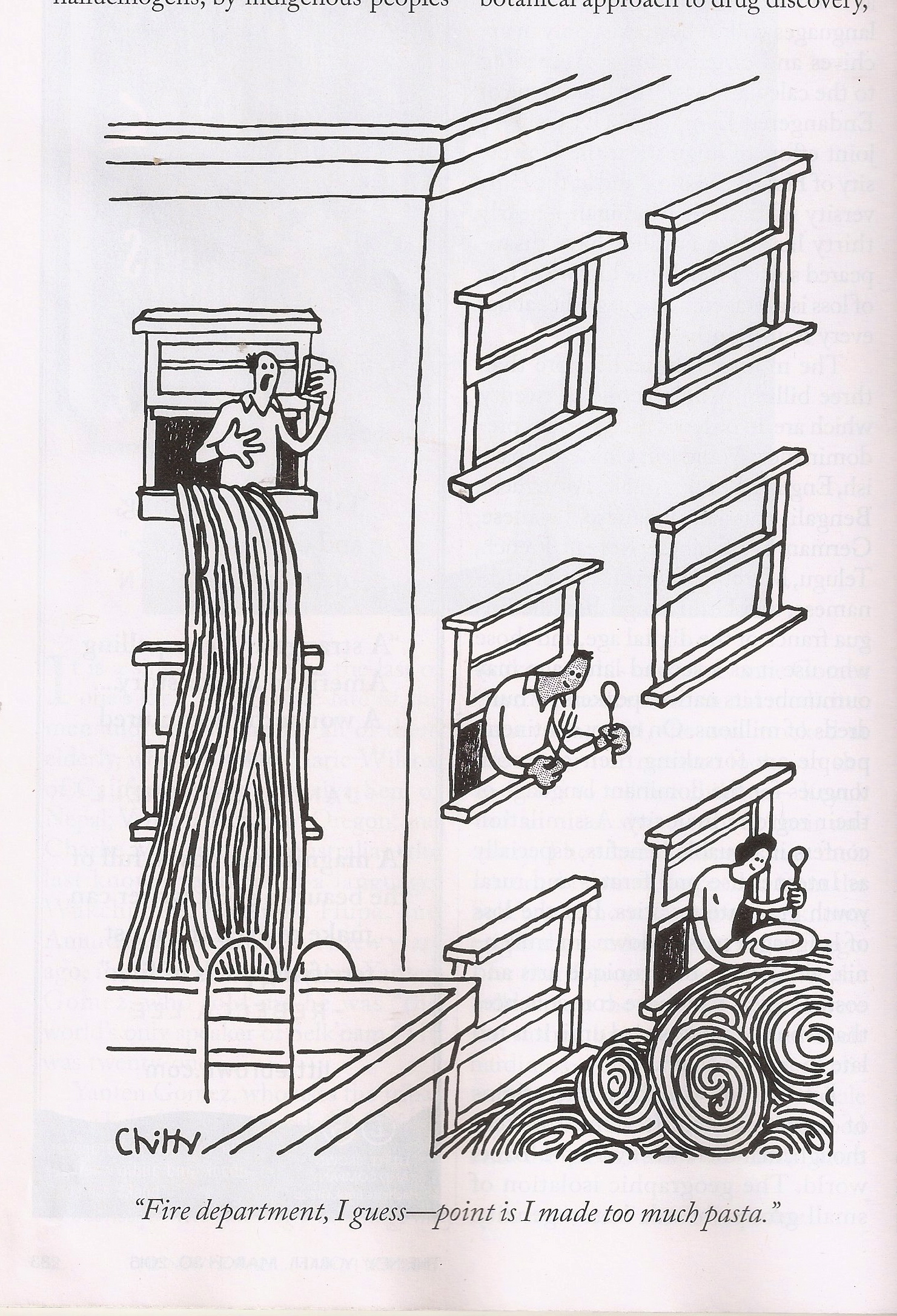 I don’t usually do this, in fact I have never done this but there is always a first time. Here is a New Yorker cartoon that my wife showed me that she thought was particularly funny. I have to agree. My beloved and I lived in Brooklyn for a year or so before heading up here to the Upper Valley of Vermont ( I had been living in NYC for about 9 years before I met my beloved). So, as apartment dwellers we can appreciate this – plus of course it has to do with food which is why I am posting it!